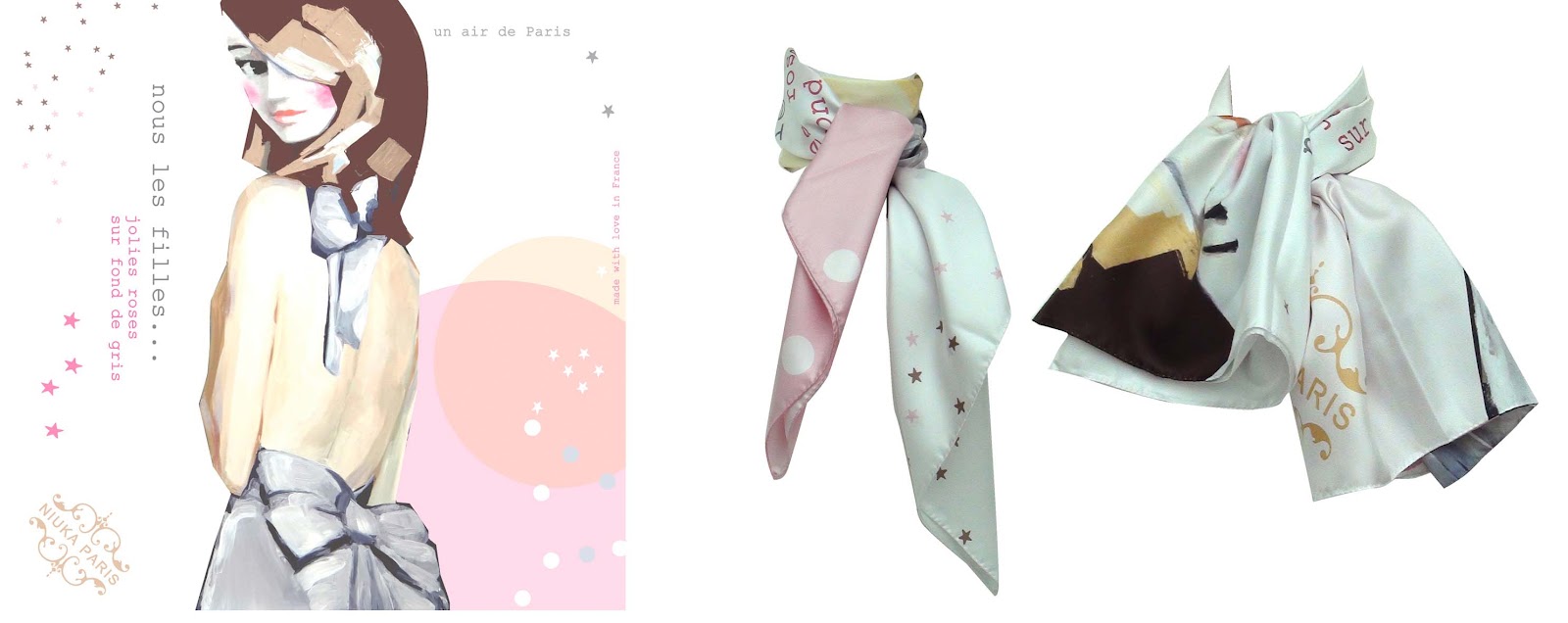 Diplômée d'une école de commerce et d'une école de design, Niuka a été initiée très tôt par sa grand-mère à la peinture. S'inspirant des jolies et élégantes parisiennes pour créer des tableaux pleins de charme et de poésie, elle décide de les décliner également sur des foulards.Foulard Emilie