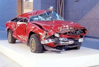 "Lavier ne ressemble à personne. Mais ses œuvres, elles, ont un sacré air de famille. On ne peut pas dire qu'une Alfa Romeo rouge, soigneusement fracassée comme celle qui sert de tombeau à Bardot dans Le Mépris, de Godard, en 1963, ressemble à un piano à queue Steinway & Sons, recouvert de tuiles épaisses de peinture noire. Ni qu'une sculpture africaine Toko, muée en gadget design par le seul usage du bronze nickelé, ressemble à un jouet des Walt Disney Productions, vision flashy de l'art moderne par le petit monde de la BD. .. source et suite : http://www.lefigaro.fr/arts-expositions/2012/10/02/03015-20121002ARTFIG00315-bertrand-lavier-la-malice-des-choses.php