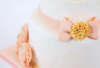 Remarque: j’ai hésité entre 5 couleurs de ruban, j’ai opté pour le saumon, mais croyez le bien qu’avec une autre couleur, l’ambiance, le style du gâteau auraient été complètement différents.