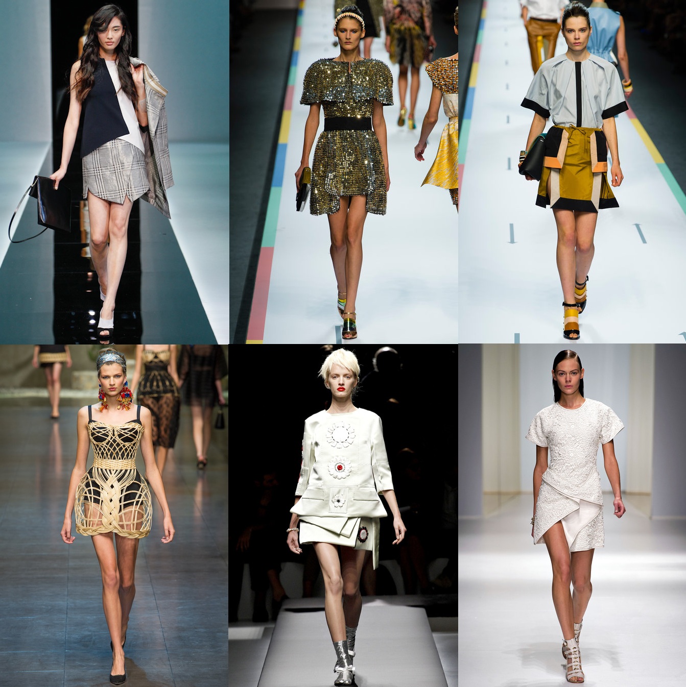 La silhouette est structurée. Des effets graphiques et de découpes ornent les jupes. Chez Prada, on se prend au jeu de l'hommage au Japon avec ses pliages évoquant l'origami et chez Dolce & Gabbana, on habille la silhouette d'un corset tout en lignes qui devient carapace. Mention spéciale à Fendi!Emporio Armani, Fendi, Fendi, Dolce & Gabbana, Prada, Salvatore Ferragamo