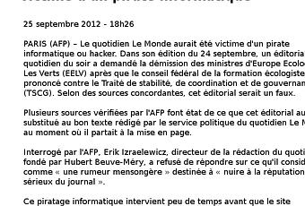 Des fois, cela sert d’avoir été journaliste. J’étais passé complètement à côté de l’éditorial du Monde exigeant la démission des ministres Europe Ecologie – Les Verts. Cet édito fait suite à la réunion du conseil fédéral de mes « amis » Verts tenue le week-end passé, réunion marquée par un vote net contre le Traité austéritaire européen. Quelle ne fut pas ma surprise quand des amis et anciens collègues m’ont appelé pour me signaler un événement de taille : dépêche AFP à l’appui, cet édito serait un faux.
