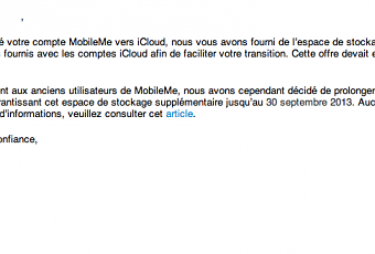 Nous vous relations dans le précédent article « Les Abonnements Mobileme ont pris fin, vérifiez ce que vous consommez…« , que l’offre iCloud initialement offerte gratuitement aux membres Mobileme (depuis la fermeture du service), prenait fin le 30 septembre.