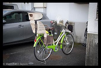 Le Japon est le pays du vélo. Dès le plus jeune âge le vélo est utilisé pour aller à l'école, faire les courses, se balader. Toutes les occasions sont bonnes. En effet il permet de se faufiler m'importe où et ne prend pas de place. Tous les vélos ont au moins un panier à l'avant. Ici même les scouts en ont un. Ainsi il est courant de voir des vélos avec un porte bébé. Mais le vélo de la super maman qui a deux enfants a forcément deux portes enfants et un panier. Vous pouvez cliquer sur la photo pour l'agrandir. Le porte bébé à l'avant n'est pas bien visible car il est en blanc. J'ai pris cette photo devant notre appartement.