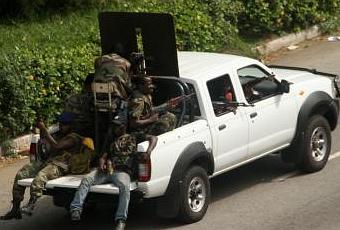 Des combattants pro-Gbagbo sur un pick-up dans les rues d'Abidjan, le 6 avril 2011.REUTERS/Luc GnagoPar Cyril Bensimon