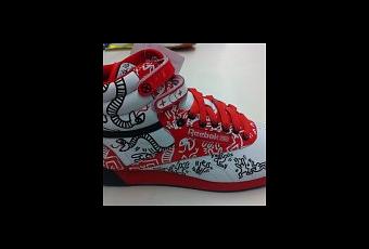 Les sneakers ont une base en cuir blanc contrasté par des accents de noir et de rouge avec l’artwork de l’artiste.