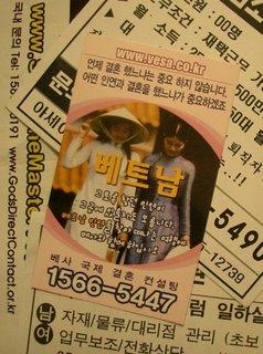 Qu'est-ce qu'on trouve comme conneries dans le métro de Séoul... petites affichettes photocopiées découpées en petits rectangles et déposées à la sauvage un peu partout, papiers distribués par des fous de Dieu vociférant leurs menaces pour l'au-delà, journaux gratuits du matin abandonnés sur les portes bagages...Sur la photo ci-contre, mon butin de la semaine: un prospectus pour le site web godsdirectcontact.or.kr, des papiers d'agences matrimoniales, et enfin la carte d'une agence spécialisée dans les mariages avec les jeunes vierges vietnamiennes, une de plus !