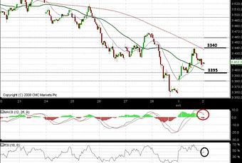 Long sur le CAC 40 avec pour objectif 3340, voir 3458 en extension. Nous revenons de très loin au niveau technique, et même si les indicateurs ne privilégient pas l'achat ils ont l'avantage d'être neutre. En cassure de 3395 points en intraday ce scénario sera invalidé.