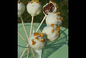 4. Tremper les cakes pops dans le chocolat blanc fondu, tapoter doucement le bâtonnet pour ôter l'excédent de chocolat. Disposer quelques morceaux d'orange confite avant que le chocolat ne fige.
