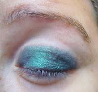 On prends l'embout "crayon" d'un pinceau et on dépose du noir au ras de cils inférieur, pas jusqu'au coin interne, on ne veut pas "fermer le regard". Par contre, au coin externe, on rejoint bien le noir du dessus. Vous pouvez aussi mettre un peu de vert pour faire un rappel de couleuuuuuur et ajouter du liner au ras de cils supérieur, le noir ça intensifie !Avec son doigt, on chope un peu de clair/irisé pour illuminer le coin interne de l'oeil. On peut aussi en placer sous le sourcil comme highlighter.