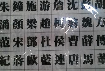 Ci dessous un tableau de 100 noms de famille, peut-être les noms de famille les plus courants à Taiwan. Un petit nombre en comparaison du 百家姓, poème chinois composé de plus de 400 noms de familles chinois. Mais saurez vous trouver les paires de caractère qui se prononcent de façon identique? - Les tons sont évidemment à prendre en compte.