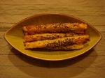 Comme tout le monde, il m'arrive d'acheter des pâte à tartes toutes prêtes (ouh ! la vilaine !) et mon plat étant tout riquiqui j'ai souvent des chutes qu'au début je transformais en mini-tartes avec plein de trucs jetés en vrac dessus. Après, flemme aidant, je me suis mise à les collectionner en les roulant en boule et hop au congèl'. J'avais peut être l'espoir secret d'en faire un jour une pâte grandeur nature, avarice quand tu nous tiens ! Jusqu'à ce que je découvre cette recette limite simplissime mais qui à le mérite d'inciter à zapper les sempiternels biscuits d'apéro du commerce pas toujours originaux (sauf ceux de Michel & Augustin !). J'ai donc ressorti mes morceaux de pâte et au boulot !
