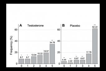 La testostérone influe sur le comportement et le comportement, à son tour, influence également les niveaux de testostérone : Cette expérience qui a placé 91 participants en situation de jeu montre que des sujets qui ont reçu 50 mgde testostérone (n=46) sous forme de gel intradermique, ont moins menti que les sujets qui ont reçu un placebo. Les sujets devaient jouer à un simple jeu de dés dans des cabines séparées. Plus leurs scores étaient élevés, plus ils recevaient une somme d'argent importante comme récompense. L'expérience était conçue de telle sorte que les participants pouvaient tricher en entrant leurs scores dans l'ordinateur, afin de gagner plus d'argent, mais que les chercheurs puissent déterminer si les sujets avaient triché ou non. Or, les sujets ayant des niveaux de testostérone plus élevés ont moins triché ! Le schéma ci-contre illustre de manière simple que les déclarations des sujets sous testostérone sont bien plus en phase avec les probabilités pures que celles des sujets sous placebo.
