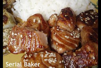 Dans un grand bol, mélanger le miel, huile de sésame, sauce soja et mirin. Bien remuer pour dissoudre le miel. Y ajouter les cubes de saumon et bien mélanger. Laisser mariner au réfrigérateur 1 heure.