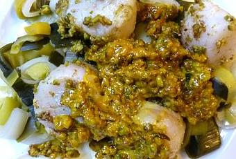 Aujourd'hui, elles sont posées sur un lit de poireaux émincés, cuits à la vapeur 35 minutes.
