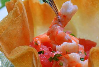 Dans un saladier, mélangez la chair de pamplemousse, les bâtonnets de surimi coupés en dés et les