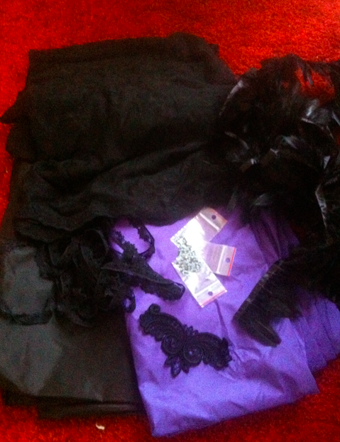 Difficile à distinguer dans tout ce noir mais dans le désordre : les tissus (du satin de soie mauve/lilas et du satin de soie noir), de la dentelle noire pour les manches, de la guipure noire, des strass noirs, des plumes noires sur ruban...J'ai attaqué la toile du corsage, qui est assez simple puisqu'il s'agit d'un corsage d'anglaise un peu adapté, avec des manches ballon.