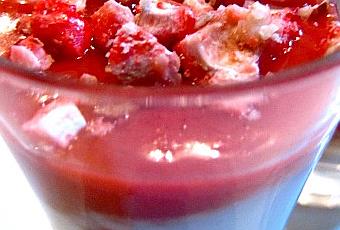 - Monter les verrines : au fond mettre les miettes de biscuit, puis une couche de crème à la praline rose, une couche de fromage blanc à la rose et finir par une couche de crème aux pralines roses et quelques miettes de pralines roses