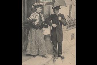 Photographie : Carte postale du tout début du XXe siècle représentant un trottin (semblant porter une jupe-culotte : la dernière mode de l'époque) et un homme la courtisant. Le texte