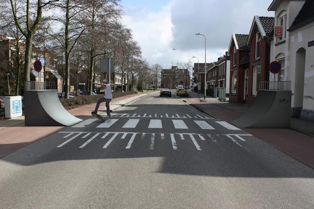 Dans sa dernière série "Out Of Place", le photographe Robert Rickhoff a effectué quelques retouches numériques pour créer dans ses images des scénari catastrophes mettant en scène des lieux du quotidiens. Un tobogan qui débouche directement sur une route, un skatepark sur un passage piéton ou encore des bosses sur des rails de chemin de fer.