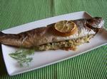 Nettoyer les truites. Les rincer sous l’eau et les éponger. Faire tremper le pain, l’essorer. Ne garder que la mie. La mettre dans un plat. Découper le fenouil en très petits morceaux. Prélever un peu de verdure et le couper finement. Emincer l’échalote. Ajouter dans le plat, le fenouil, l’échalote, l’oeuf entier battu, la poudre de gingembre et le persil. Arroser de 2 c. à s. de vin blanc et d’une c. à s. de crème fraîche. Saler et poivrer. Mélanger le tout (si le mélange est trop humide ajouter un peu de chapelure, si trop sec ajouter un peu de crème fraîche. Farcir les truites. Les poser dans un plat allant au four beurré. Saler et poivrer. Arroser de vin blanc. Poser sur chaque truite, une rondelle de citron et une noisette de beurre. Cuire à four th 7, 20 à 30min.