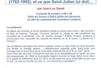 Ne manquez pas cette conférence donnée par Jean-Luc Daval. Il est l'un des meilleurs connaisseurs de Carouge, et le lien qu'il envisage de faire entre les deux anciennes villes sardes réserve à coup sur des surprises fort interessantes