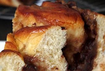 2. Une fois votre pâte levée et froide, étalez la crème de marrons sur la pâte en vous arrêtant à 3cm du bord environ, parsemez de pépites de chocolat (ici des chunks noirs) puis roulez votre rectangle sur lui-même, comme pour une bûche.