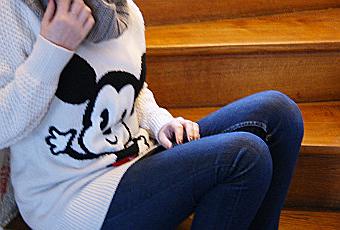J'ai craqué sur un gros pull H&M Divided (Encore H&M ? Je pourrais faire un effort et vous sortir du Yves Saint Laurent, quand même !) au motif plus que régressif : un beau Mickey "mal dessiné", comme m'ont dit mes proches. Pour ce qui est des gros pulls, les blancs, crème et beiges restent mes préférés. Ils me rappellent que l'hiver n'est pas loin et ils attirent le peu de lumière auquel nous avons droit. Et puis, il y a le côté "doudou", du pull, lorsqu'il est tout doux, qui me séduit assez. Heureusement, celui-ci, en matière de forme, se tient bien et tombe juste comme il faut sur les hanches !