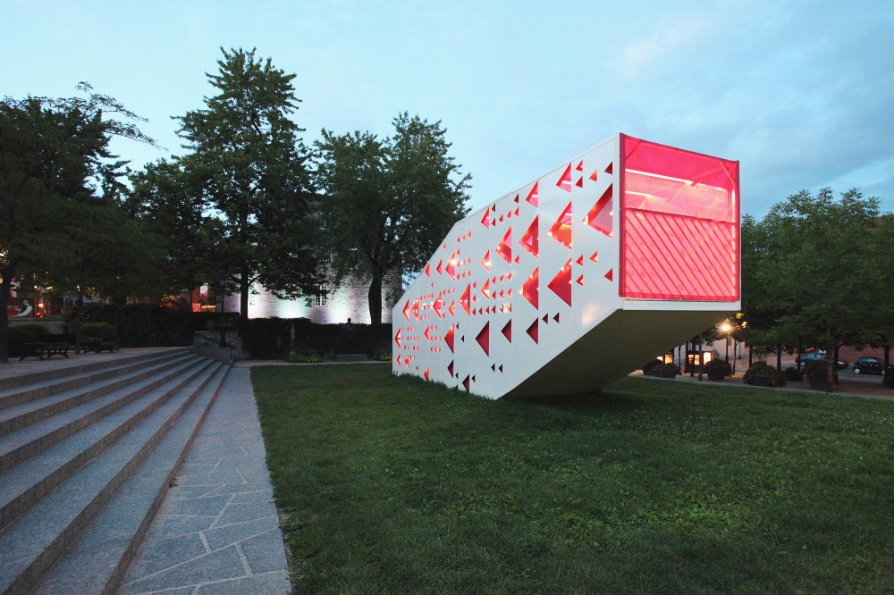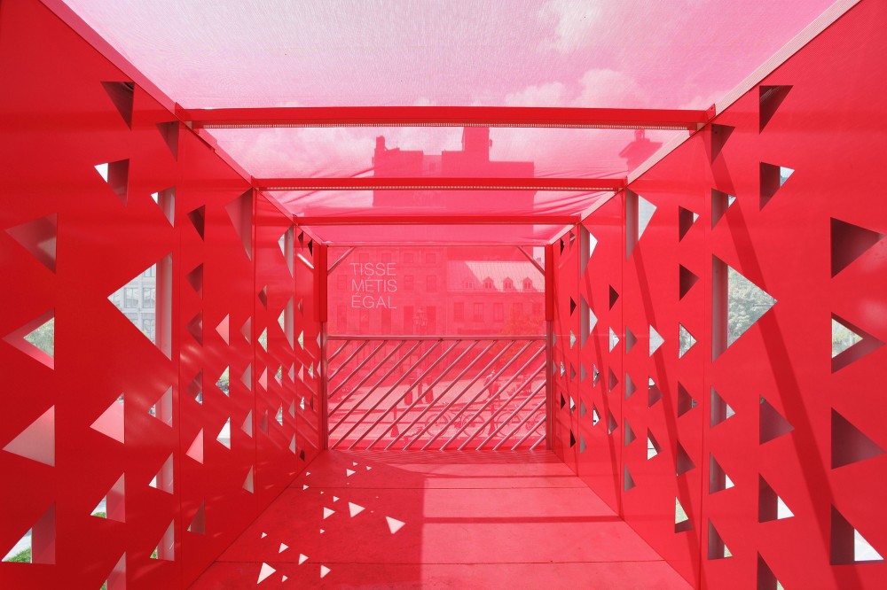 Érigé au cœur du quartier historique, cette installation contemporaine agit comme un filtre de couleur vive qui transforme notre perception de l'environnement. Ses murs perforés de motifs triangulaires évoquant le tissage traditionnel ; une interprétation contemporaine de l'histoire et de la culture québécoise.