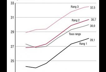 C'est 4 ans plus tard qu'il y a 50 ans et c'est à 28 ans que les femmes françaises choisissent d'avoir leur premier enfant, un âge qui augmente un peu plus chaque décennie mais à un rythme plus ralenti et qui reste en ligne avec la moyenne européenne. De même, l'âge des naissances suivantes recule, aboutissant à un âge moyen d'accouchement quel que soit le rang de naissance, de 30 ans. Désormais le modèle de famille française est à deux enfants, les familles nombreuses ne représentant plus que 18 % des familles et les naissances de 3è rang ou plus, plus que 21% des naissances de l'année.