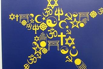 Regardez de près cette affiche de promotion. Vous ne remarquez rien ? Côte à côte avec les symboles de la chrétienté, du judaïsme, du jaïnisme, et ainsi de suite, on y trouve un des emblèmes les plus malfaisants que l'humanité ait jamais conçus : la faucille et le marteau.