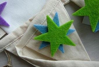 Les nouveaux Craft Bags contiennent une guirlande de fanions en coton, à customiser avec des étoiles de feutrine épaisse. Pour fixer ces étoiles, des points de colle (ainsi qu'une petite notice explicative sur l'utilisation de ces points de colle) sont fournis.