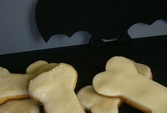 3) Etaler la pâte sur 0,3mm d'épaisseur et découper des os à l'aide d'un emporte pièce. Enfourner 10 minutes th°6. Laisser refroidir