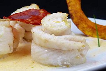 Ingrédients : 3 filets de sabre, 6 tranches de chorizo fort, 1/2 potimarron, crème liquide, piment d'Espelette, épices mexicaines, huile d'olive.