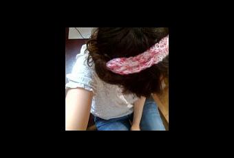 Et je n’ai pas attendu les vacances pour commencer ! Je me suis donc fait un ruban pour cheveux ! Un peu de laine blanche, de laine rose et c’est partit !