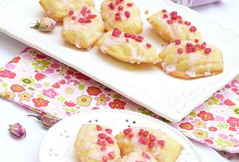 - A l'aide d'une cuillère, arroser les madeleines avec le glaçage et saupoudrer d'éclats de roses cristallisés.