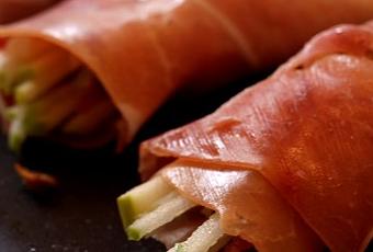 Vous posez donc un joli petit tas de julienne d'un côté de la tranche de jambon. Répartissez dessus des noisettes au bacon. Et vous roulez. C'est tout !