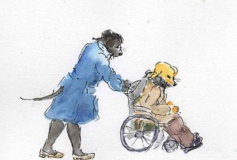 Ce n'est pas un perdreau de la dernière couvée celui-là. Plutôt un vieux de la vieille. Presque un ancêtre. Après avoir supporté son mauvais caractère et ses frasques, sa femme pousse maintenant son fauteuil roulant ! Quelle vie.