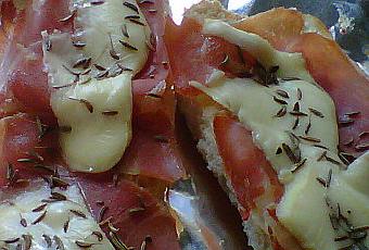 Déposer le jambon serrano, les tranches de gouda et les graines de carvi.