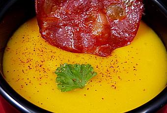 Pour un bon velouté, il vous faut : 1 potimarron, 1 pomme de terre, 1/2 gousse d'ail, 1 bouillon de volaille, du curry, 1 cs de crème fraîche, du sel et du poivre, des tranches fines de chorizo, huile d'olive.