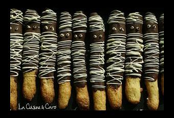 4. Faire fondre le chocolat noir dans un verre, puis y ajouter le chocolat au lait et mélanger pour qu'il fonde bien. Plonger les fingers au 3/4. Laisser figer le chocolat.