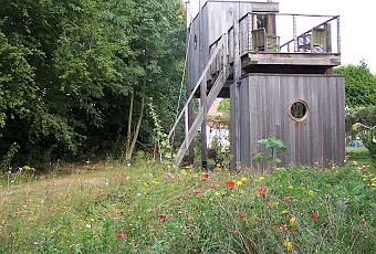 PS : la photo illustrant cet article a été prise chez un ami qui a fabriqué ce chalet comprenant une terrasse couverte en bas, des toilettes et une douche dans le module devant et au dessus, dan sle module du haut, une grande pièce avec terrasse.