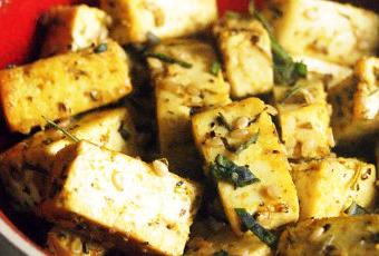Chauffer une poêle et y cuire le tofu pendant 4 à 5 minutes pour le faire bien dorer.
