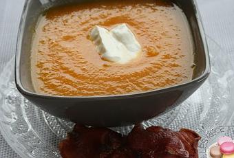 Servir le velouté avec une quenelle de creme fraiche et les chips de bacon.