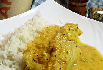 Faites chauffer l’huile dans une poêle et, lorsqu’elle est bien chaude, versez les graines de moutarde. Attendez qu’elles commencent à grésiller, puis ajouter les graines de fenouil, les piments verts, les feuilles de curry et le gingembre. Mélangez et laissez cuire à feu moyen pendant quelques minutes. Mixez les oignons et incorporez-les aux épices. Laissez dorer cette préparation pendant environ 5 à 10 minutes. Ajoutez la poudre de chili et le curcuma. Mixez les tomates et versez les dans la sauce. Comptez 5 minutes puis versez 2 verres d’eau et le lait de coco. Faites mijoter pendant 5 minutes pour que le mélange épaississe légèrement, puis salez. Cette sauce sera la base du curry. Ajoutez le saumon et faites cuire 3 minutes avant de rajouter le cabillaud et laissez cuire 5 minutes de plus. Avant de servir, ajoutez des feuilles de coriandre hachées. Servez avec un riz basmati.