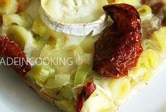Encore une fois je me retrouve avec des restes. J'avais des tomates confites maison, un poireaux, plus 1 tout petit, du caviar d'aubergines maison... Enfin bref un tas de trucs. Puis en fouinant dans mon congélo il me restait de la pâte à pizza. Et là j'ai eu une super idée! Franchement incroyablement bonne cette pizza, 100% improvisation!