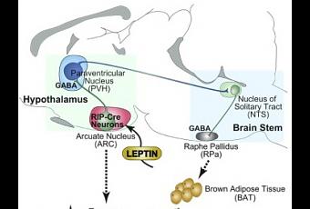 Le rôle très particulier des RIP-Cre neurons : Il s'agit d'une population unique de neurones située à la base du cerveau dans le noyau arqué de l'hypothalamus qui vient d'être identifiée. Dans cette étude, des souris génétiquement modifiées de manière à empêcher ces neurones de libérer le neurotransmetteur GABA, développent une obésité totalement liée à l'impossibilité de brûler les graisses. Sur autre groupe de souris chez lesquelles ces neurones peuvent être sélectivement activés à des moments différents, l'équipe montre que ces neurones conduisent la dépense énergétique dans le tissu adipeux brun. Or la graisse brune brûle l'énergie pour produire de la chaleur. En conclusion, la libération de GABA de ces neurones entraîne sélectivement la dépense énergétique, la dépense énergétique étant entièrement dépendante de la libération de GABA.