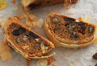 Un strudel , on pourrait croire que je vous propose une recette autrichienne mais non cette recette est anglaise ... mais peu importe elle est surtout très bonne . Je me rends compte que j'apprécie de plus en plus les courges en version sucrée , dans un billet précédent je vous avais proposé un cake sucré au butternut, aujourd'hui c'est une autre variante . Le butternut est très doux et se cuisine facilement . Pour le strudel je ne fais pas encore ma pâte , j'essayerai tôt ou tard mais pour l'instant j'achète celle du commerce assez proche de la pâte filo, je vous conseille d'utiliser de la pâte filo .