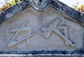 La seconde stèle comporte un assemblage d'outils de tailleurs de pierre qui ne ressemble pas à un blason compagnonnique, quoique les variantes aient été multiples. On y distingue un compas, un marteau et une équerre.