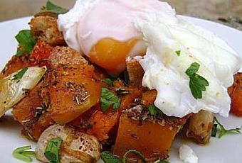 3. Dans une casserole, faire bouillir de l’eau. Y casser les œufs et les faire cuire 2 minutes l’un après l’autre, ou jusqu’à ce que le blanc se soit solidifié. Récupérer l’œuf à l’aide d’une écumoire et les déposer délicatement sur du papier absorbant. Le déposer ensuite sur les dés de courge butternut et servir immédiatement.