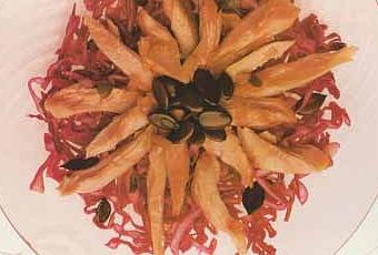 Arroser d’une vinaigrette balsamique avec les graines de potiron.